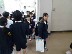 | 2026.4.16 2年生が1年生を学校案内 2年生が1年生の教室を訪れ、プレゼントの首飾りを渡して、学校を案内しました。2年生が1年生の手を優しくつないで、いろいろな教室を案内しました。授業中なので先生から「静かに回ろうね。」と言われていましたが、にこやかに、にぎやかに楽しく回っていました。 |