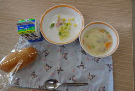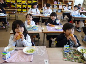 | 2026.4.17 1年生 初めてのパン給食 今年度、春日小学校では毎週木曜日がパン給食です。今日の献立は、パン・牛乳・米粉のクリームシチュー・アスパラサラダ。1年生にとって初めてのパン給食の日でした。パン袋を開けるのに苦労している児童もいましたが、無事パン袋を開けておいしく完食していました。 |