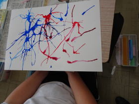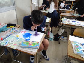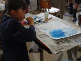 | 2026.4.20 5年生 図画工作科「心のもよう」 「バブリング」「吹き流し」「クレパスを使う」など、いろいろな表し方を使って描き、描いた絵からどんな思いが浮かぶか考え、交流していました。彩り鮮やかにいろいろな技法を使い分けながら、楽しんで表現していました。 |