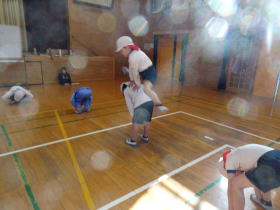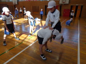 | 2026.3.9 馬とび 暖房により温かくなった体育館で2年生が体育をしていました。馬跳びをしています。馬跳びは、一人がかがんで「馬」となり、もう一人がその上を開脚しながら跳び越える遊びです。最初は低くかがんでまたいでいる子が多かったのですが、だんだんと「馬」が安定し、リズムよくとびこえる子が増えていきました。 |