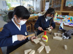 | 2026.3.16 ギコギコトントン 4年生が図工の時間にのこぎりや金づちを使って造形をしました。このごろは家庭でのこぎりなどを使う機会はほとんどなく、子どもにとっては使い方を学ぶ貴重な経験になりました。 |