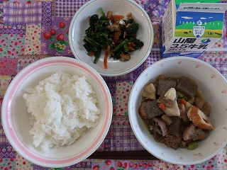 今日の給食は、ごはん・さばの照り煮・昆布和え・冬瓜汁です。