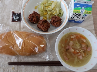 今日の給食は、ドライカレー・フレンチサラダ・冷凍みかん・牛乳です。