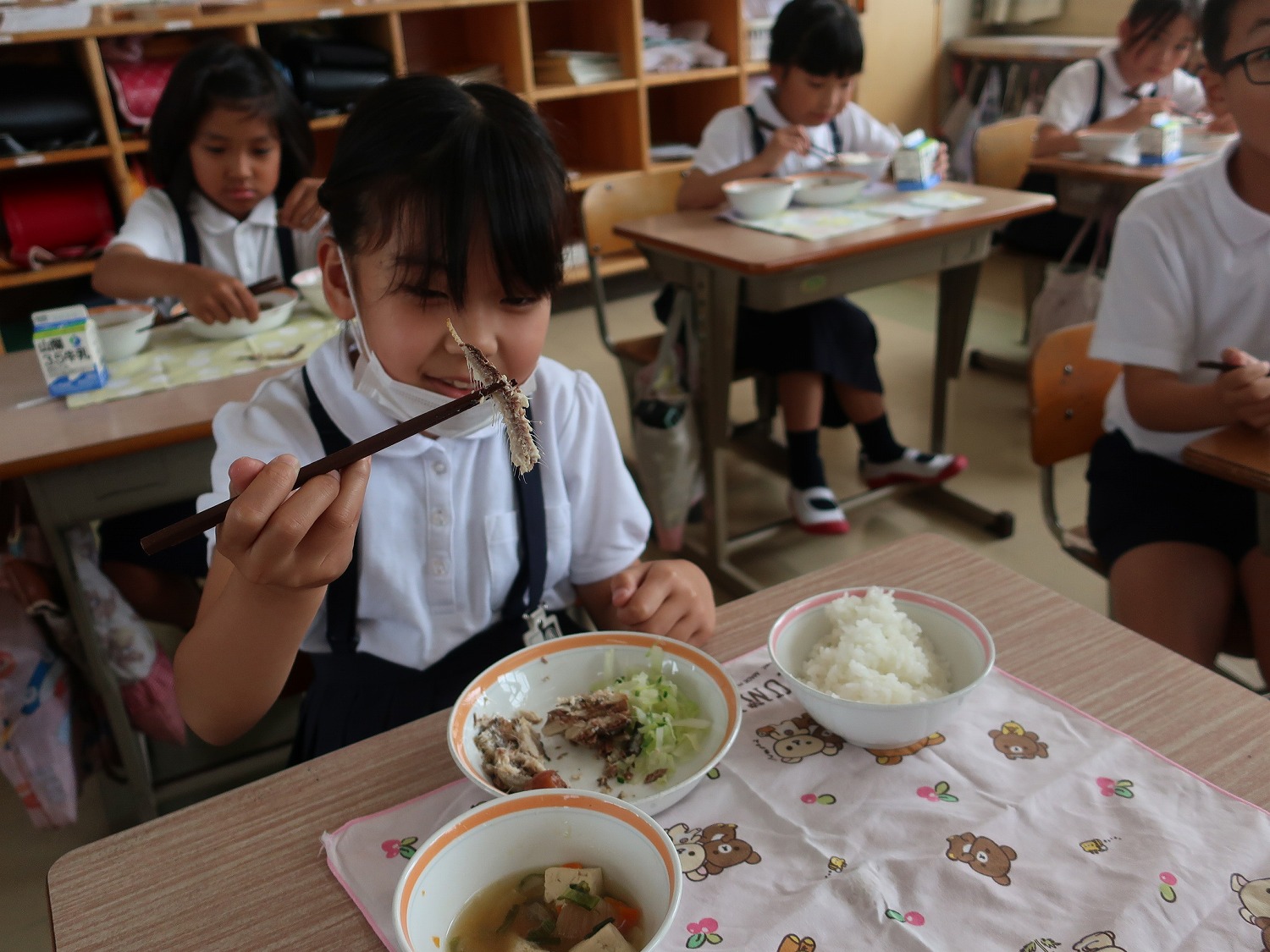 2学期初日、1年生の給食当番が進んで準備をする姿が見られました。