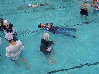 服を着て水につかると体が動かしづらいこと、仰向けになると息をしながら浮けることなど体感することができました。