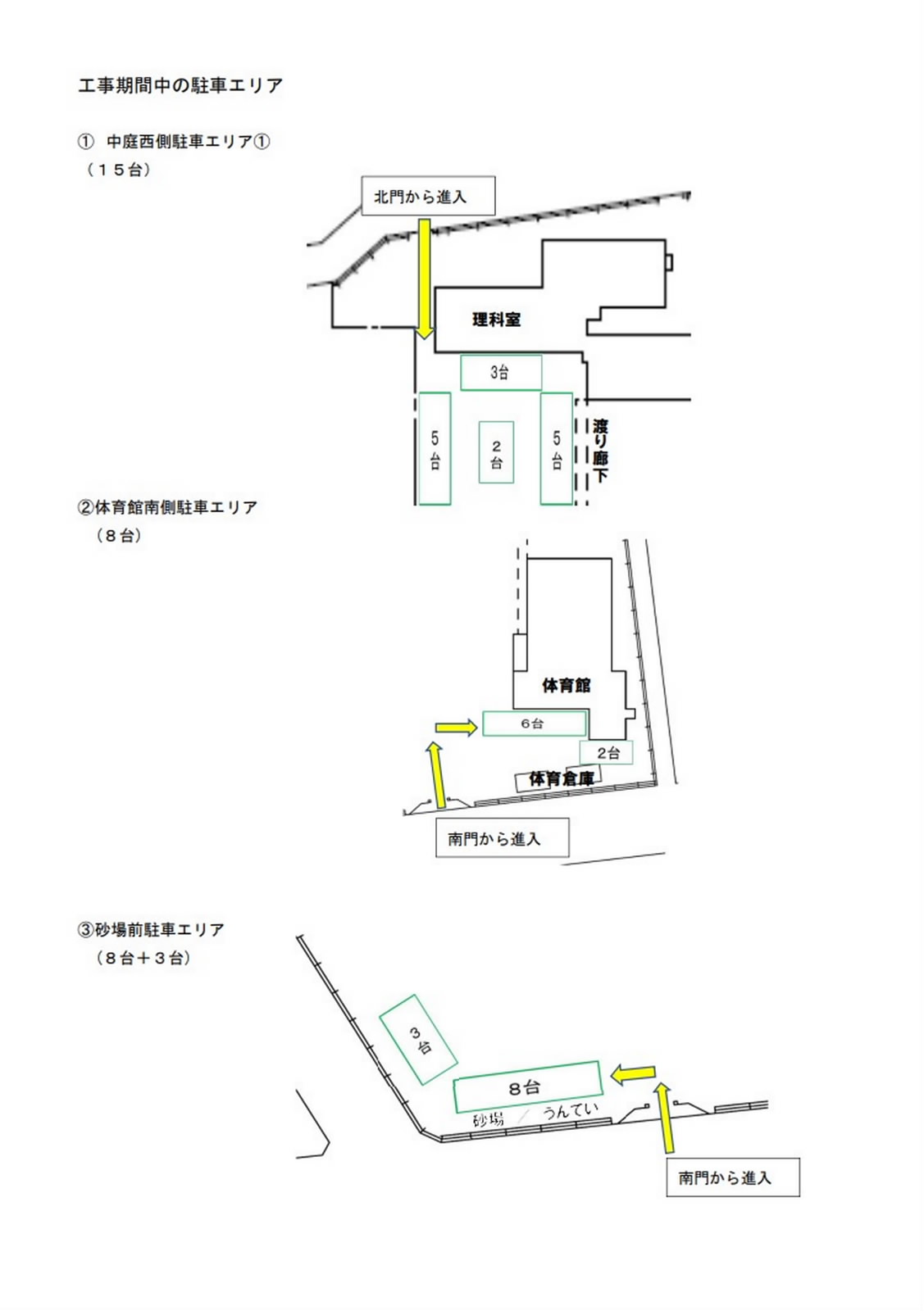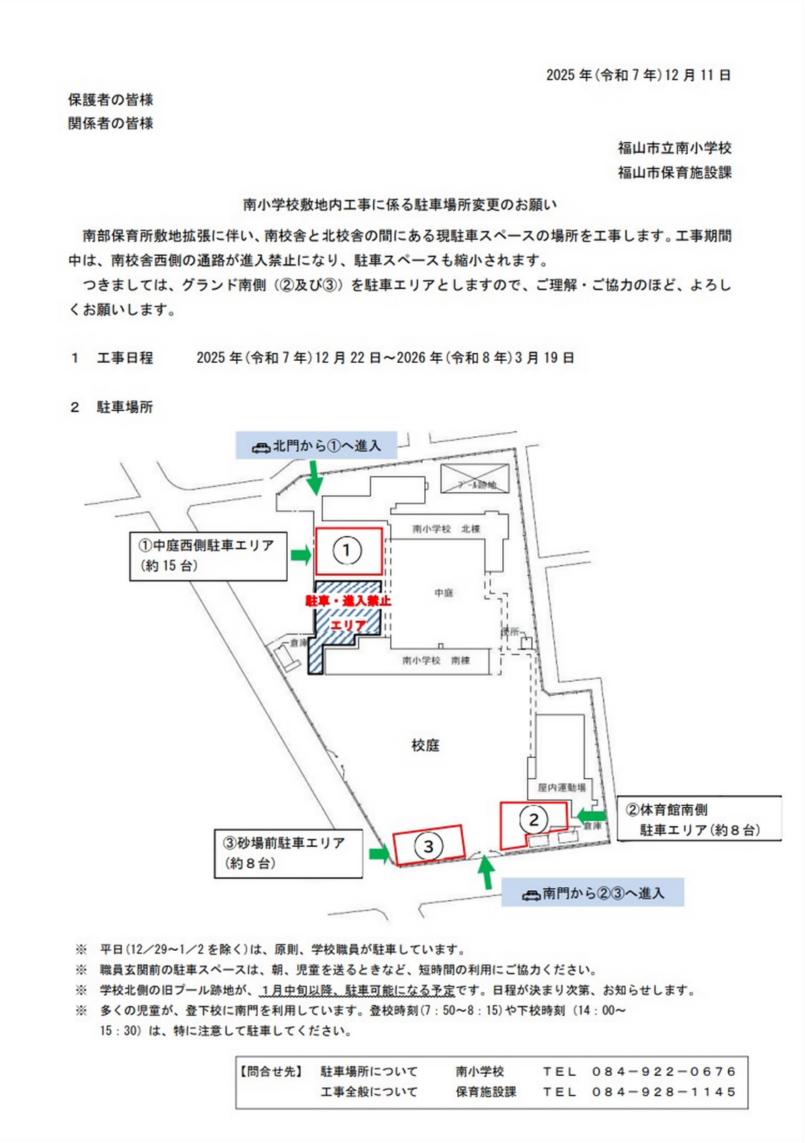南小学校敷地内工事に係る駐車場所変更のお願い 南校舎と北校舎の間にある現駐車スペースの場所を工事します。 工事期間中は、南校舎西側の通路が進入禁止になり、駐車スペースも縮小されますので、ご理解・ご協力のほど、よろしくお願いします。 PDFはこちら