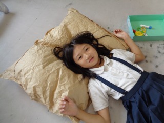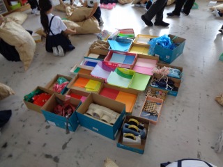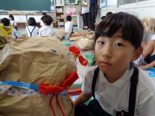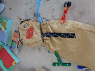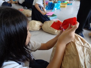 クラフト紙に新聞紙を詰め、作成した袋を「親友」に見立て、用意されたたくさんの材料を使って、発想豊かに飾りつけを楽しみました。